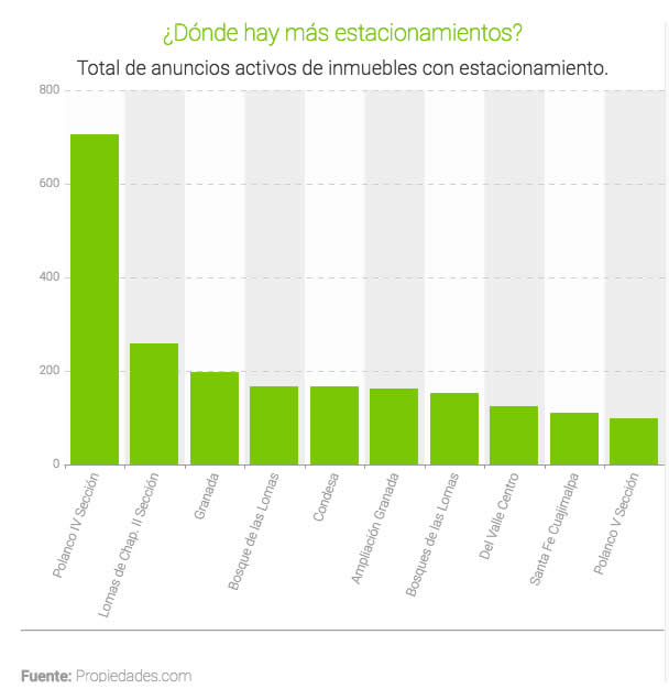 Las colonias con la mayor cantidad de anuncios activos que cuentan con cajón de estacionamiento son Polanco IV Sección, Lomas de Chapultepec II Sección y Granda.